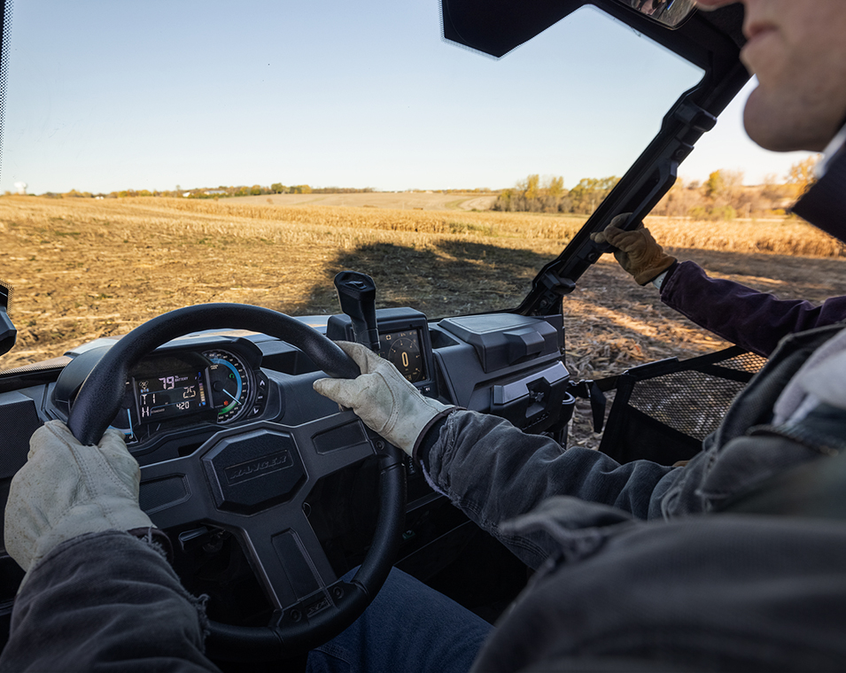 - Förarcentrerat analogt instrument med dubbla mätartavlor och 4 tums flerfärgs LCD informationsdisplay för: Effektförbrukning och Regenerativ effekt i %, Batteriets återstående effektnivå i %, Återstående körsträcka, Laddningsnivå, Batteritemperatur, Motortemperatur, Spänningsnivå för tillbehör, Hastighetsmätare, Total körsträcka, Trippmätare, Växelindikering, Serviceindikator och felkoder, Programerbart Serviceintervall, Säkerhetsbältesvarning, Justerbar Instrumentbelysning och Ljusstyrka, Klocka. Premiumsäten med Skålade Ryggstöd och Broderat Polaris-märke, Premiumratt och Interiördetaljer, Polaris Pulse Kopplingsplint Med 6 st Uttag För Elektriska Tillbehör, Strömuttag, Dubbla USB-uttag, 12V SAE-uttag Vid Lastflaket Med Strömbrytare i Instrumentpanelen
